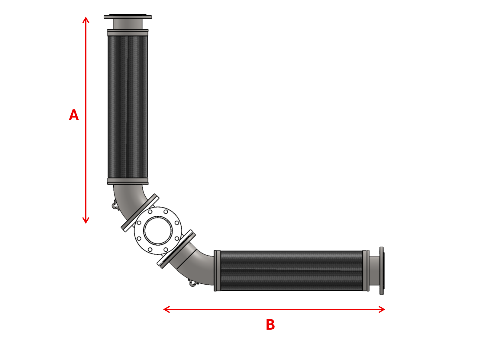 The Dog Leg is in the Metraloop family of products. It incorporates the same proven hose and braid technology but in this case at right angles to each other. This gives the benefit of absorbing movement from two different runs of pipe. Another advantage is that the dog Leg stays in the original path of the pipping, making it the most compact way to absorb pipe movement. For all these reasons the Dog Leg is often used in Value Engineering a piping system